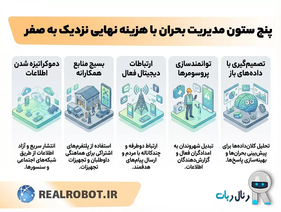 مدیریت بحران هزینه نهایی نزدیک به صفر، شهروندان را از مصرفکنندگان منفعل به “پروسومرها” (Prosumers) – یعنی هم تولیدکننده و هم مصرفکننده – در فرآیند واکنش به بحران تبدیل میکند. با آموزش و تجهیز افراد به ابزارهای ساده (مانند گوشیهای هوشمند)، آنها میتوانند در گزارشدهی حوادث، ارزیابی خسارات، ارائه کمکهای اولیه و حتی مشارکت در فعالیتهای بازیابی نقش فعالی ایفا کنند. این توانمندسازی، بار را از دوش نهادهای رسمی برداشته و تابآوری محلی را به شدت افزایش میدهد.